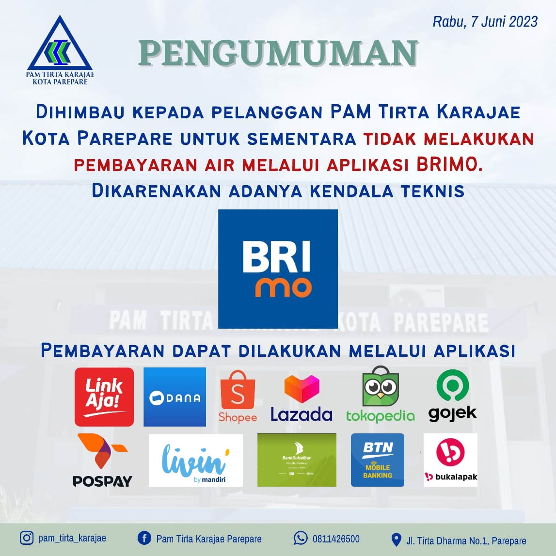 Perusahaan Umum Daerah (Perumda) Air Minum / PAM Tirta Karajae Parepare menghimbau pelanggan agar untuk sementara waktu tidak melakukan pembayaran air melalui aplikasi BRImo. Hal itu diungkapkan Direktur PAM Tirta Karajae Parepare, Andi Firdaus Djollong, Rabu (7/6/2023). Firdaus mengatakan, ba